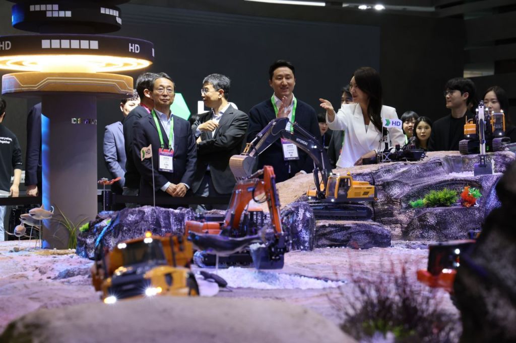 정기선 HD현대 수석부회장이 8일 2025서울모빌리티쇼 HD현대관을 방문해 RC 굴착기 디오라마를 둘러보고 있다. HD현대사이트솔루션 제공