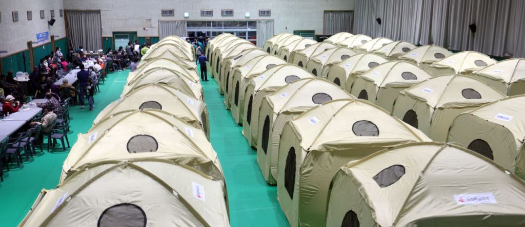 7일 오후 경남 하동군 옥종면 옥천관에 마련된 하동 산불 이재민 대피소에서 이재민, 공무원, 자원봉사자 등이 모여 있다. 연합뉴스