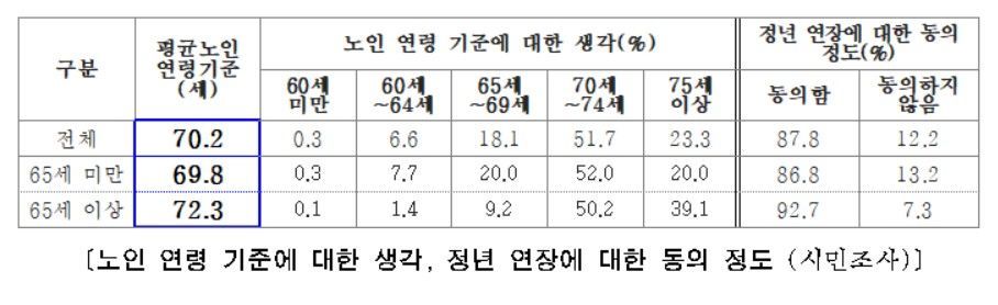 조사 결과 시민들이 '노인'이라고 생각하는 나이는 평균 70.2세였다. 특히 절반이 넘는 51.7%가 70~74세를 노인이라고 답했다. 65세 이상 응답자의 경우 노인 기준연령을 72.3세라고 답했다.