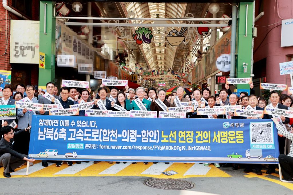 경남 의령군은 남북 6축 고속도로의 합천-의령-함안 구간 연장을 위한 범군민 홍보 및 서명운동 캠페인을 지난 8일 의령전통시장 일원에서 대대적으로 전개했다.