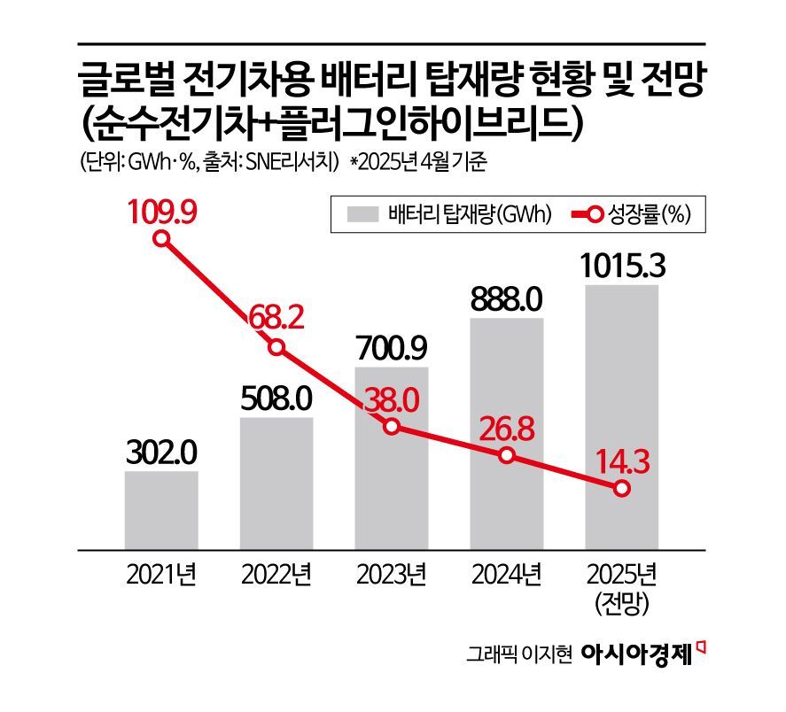 한편, SNE리서치는 올해 전기차 판매 성장률아 15.4%에 머물며 지난해(26.1%)와 비교해 둔화할 것으로 전망했다. 유럽에서는 EU가 자동차 탄소배출 규제를 완화하면서 전기차 보급 속도가 느려지고 북미에서는 트럼프 상호 관세의 영향으로 자동차 시장이 위축될 것으로 내다봤다.