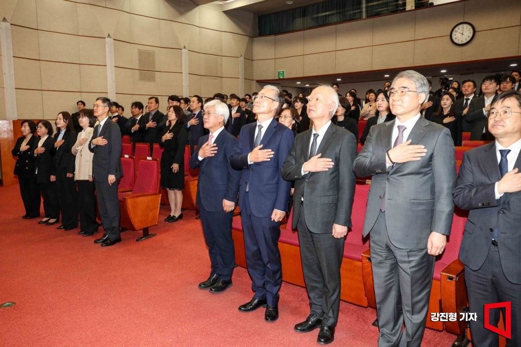 마은혁(오른쪽 다섯 번째) 헌법재판소 재판관이 9일 서울 종로구 헌법재판소에서 열린 취임식에 참석해 국민의례 하고 있다.