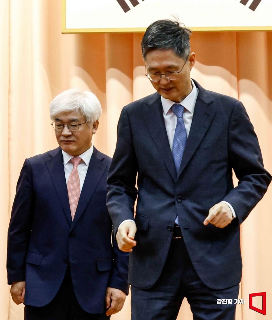 마은혁(왼쪽) 헌법재판소 재판관이 9일 서울 종로구 헌법재판소에서 열린 취임식에 참석해 문형배 헌법재판소장 권한대행과 사진촬영을 마친 뒤 이동하고 있다.