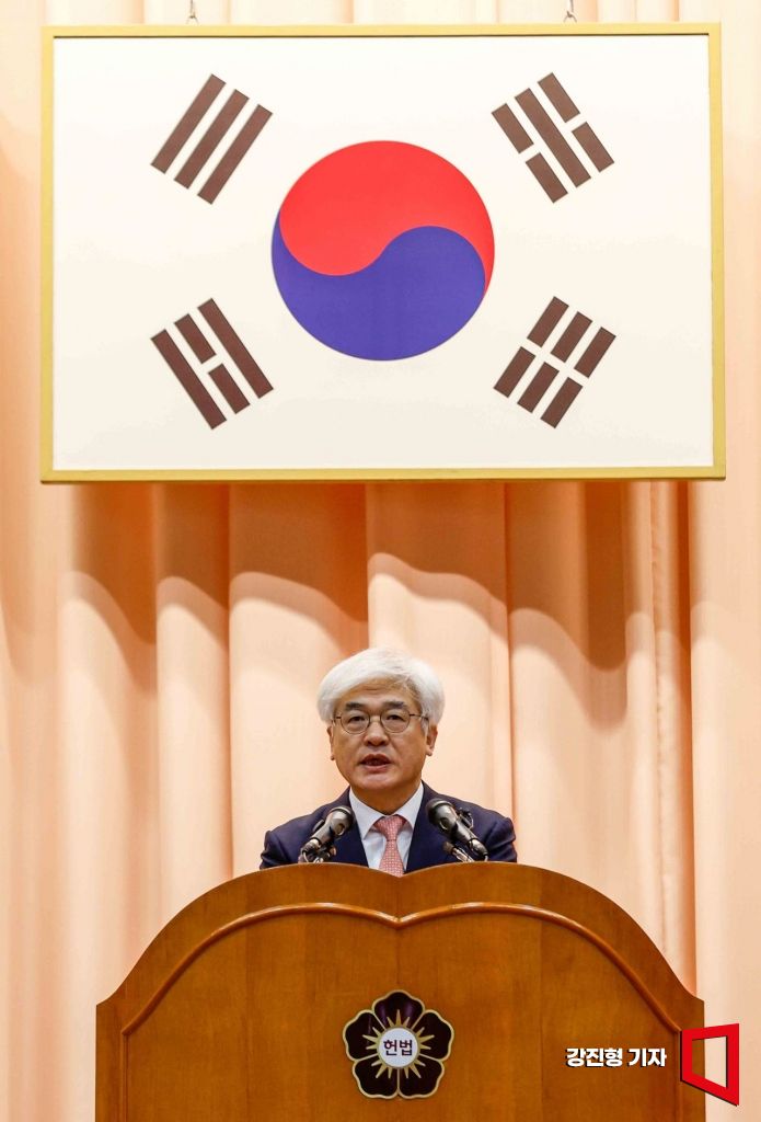 마은혁 헌법재판소 재판관이 9일 서울 종로구 헌법재판소에서 열린 취임식에 참석해 취임사 하고 있다.
