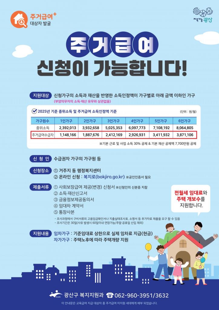 광산구는 주거급여와 선정 기준이 유사한 교육 급여 수급 가구 2,755세대를 대상으로 전수 조사를 실시해 지원 대상자를 선제적으로 찾아낼 계획이라고 9일 밝혔다. 주거급여는 중위소득 48% 이하(4인 가구 기준 월 292만 6,931원) 가구에 지급되며, 신청 가구의 소득과 재산을 반영해 결정된다.