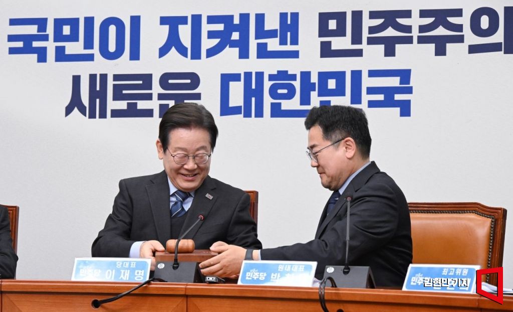 이재명 더불어민주당 대표가 9일 국회에서 열린 최고위원회의에서 사퇴 의사를 밝힌 뒤 권한대행을 맡을 박찬대 원내대표에게 의사봉을 넘기고 있다.