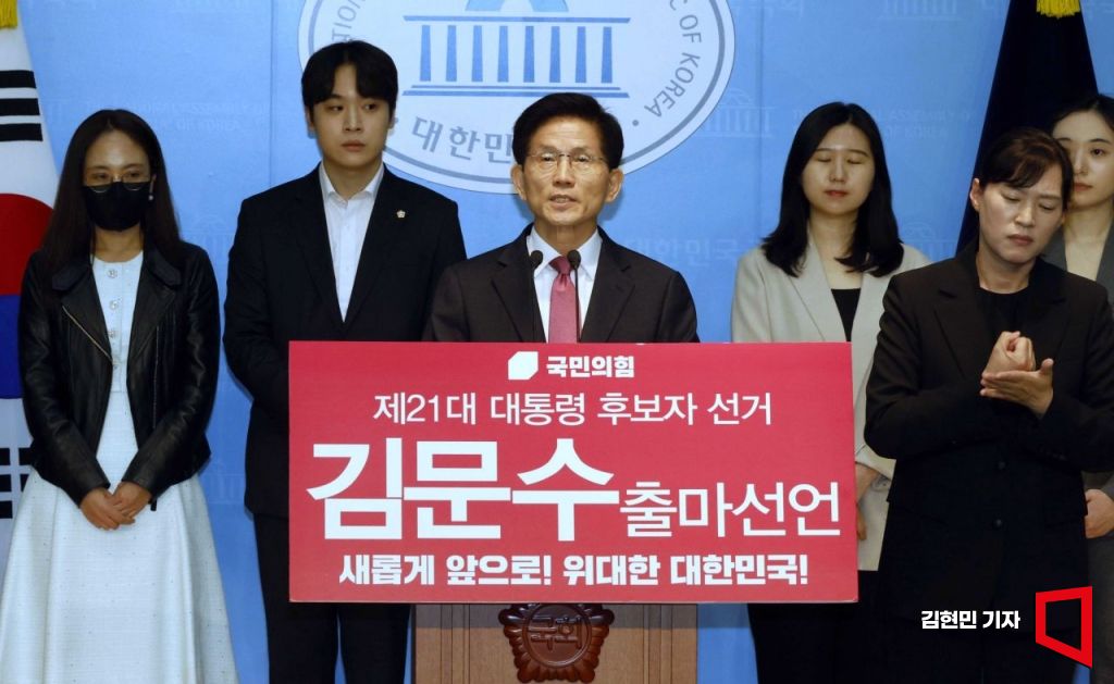 김문수 전 고용노동부 장관이 9일 국회에서 기자회견을 열어 제21대 대통령 선거 출마 선언을 하고 있다.