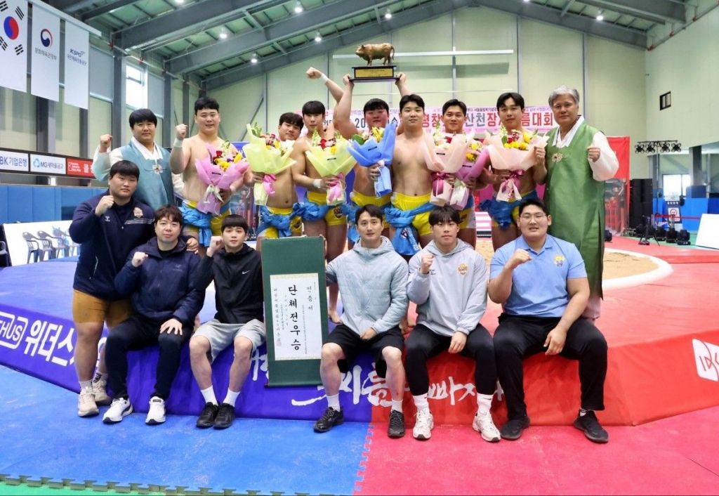 울주군청 해뜨미씨름단이 지난 2일부터 8일까지 강원특별자치도 평창군 진부생활체육관에서 열린 ‘2025 평창오대산천장사씨름대회’ 단체전에서 우승하며 황소 트로피를 들어 올렸다.