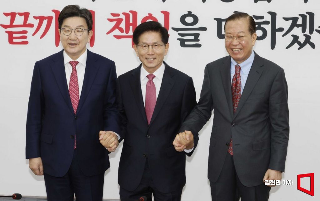 김문수 전 고용노동부 장관이 9일 국회에서 권영세 국민의힘 비상대책위원장, 권성동 원내대표를 만나 손을 잡고 기념촬영하고 있다.