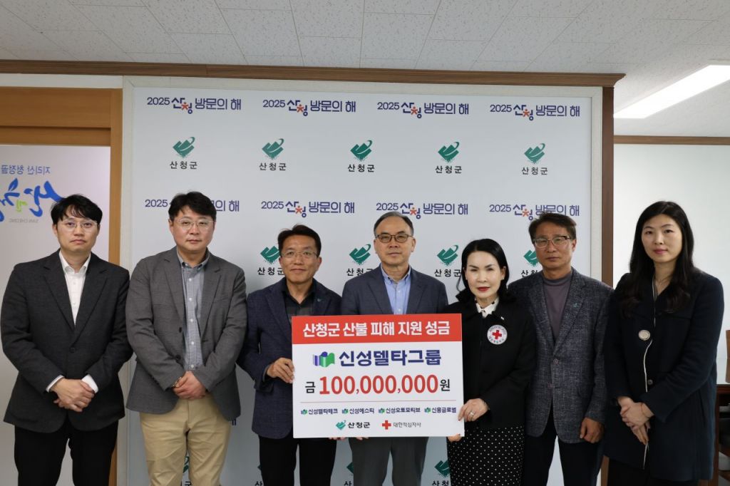 신성델타테크는 경남 산청군에 산불피해 성금 1억원을 전달.