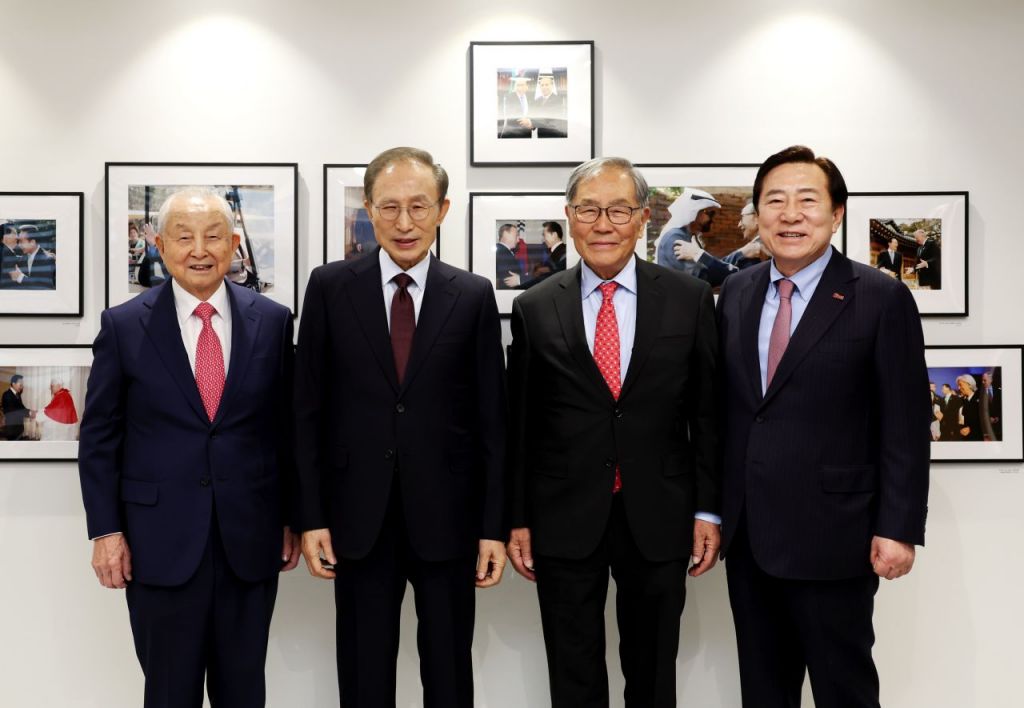 왼쪽부터 김장환 세계한인비즈니스대회 고문, 이명박 전 대통령, 박선근 세계한인비즈니스대회 명예대회장, 김기문 세계한인비즈니스대회 대회장이 기념 사진을 찍고 있다. 중소기업중앙회