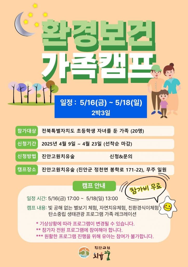 전북 진안군이 오는 23일까지 진안고원 치유숲에서 도민건강증진을 위한 환경보건가족캠프 2박 3일 참가자를 모집한다.
