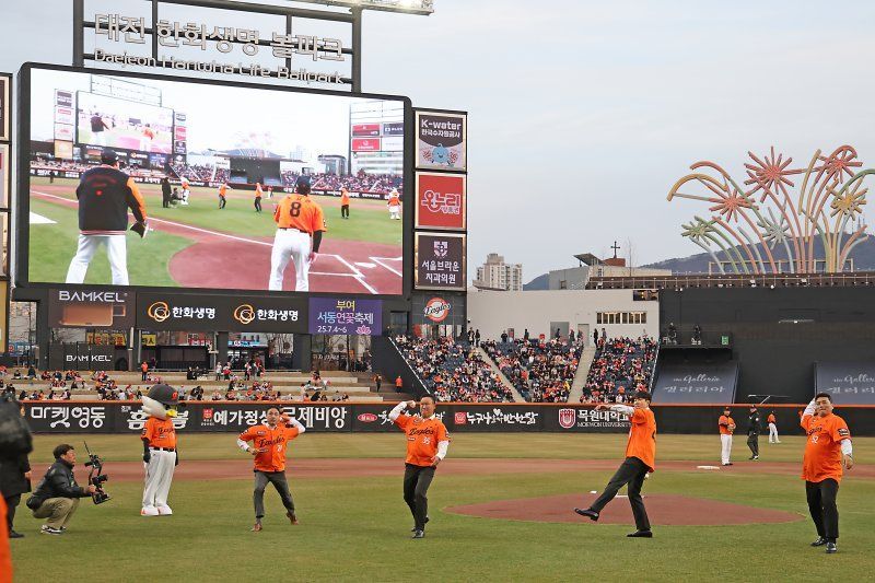 지난달 28일 대전 한화생명 볼파크에서 열린 2025 KBO리그 프로야구 한화 이글스와 KIA 타이거즈의 개막전 경기에서 송진우, 장종훈, 정민철, 김태균 등 한화 영구결번 4명이 시구하고 있다.연합뉴스