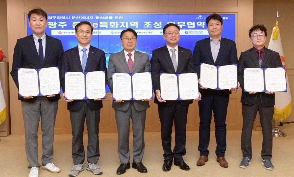 협약식에는 강기정 시장을 비롯해 박상형 한전KDN 사장, 김승남 광주도시공사 사장, 유병천 ㈜레플러스 대표, 전석 ㈜그리다에너지 대표, 김찬영 광주테크노파크 본부장 등 6개 기관·기업 대표가 참여했다.