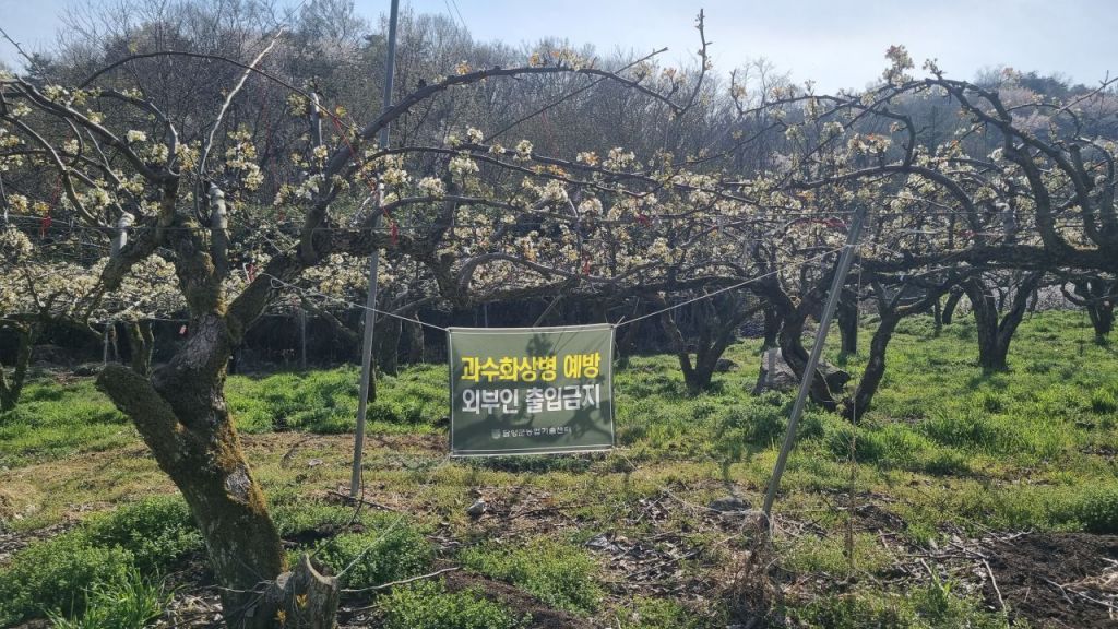 군은 지난달 읍·면 농업인상담소를 통해 사과·배 농가에 과수화상병 사전 방제 약제 3회분을 공급했다. 개화기 1차 약제는 세레나데아소로 개화 50% 시기로부터 5~7일 후에 살포한다. 2차 약제는 아그리파지이며, 2차 약제 살포 5~7일 후에 살포한다.
