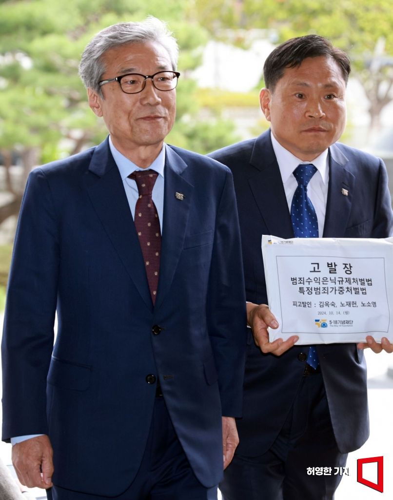 5.18기념재단이 노태우 전 대통령 부인 김옥숙 씨와 아들 노재헌, 딸 노소영씨를 최근 재판에서 드러난 노 전 대통령 비자금 의혹과 관련해서 범죄수익은닉규제처벌법과 특정범죄가중처벌법 위반으로 지난해 10월 14일 대검찰청에 고발했다. 원순석(왼쪽) 이사장 등이 고발장을 접수하기 위해 대검찰청 민원실로 들어가고 있다. 허영한 기자