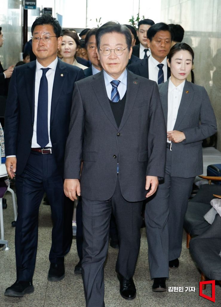 이재명 더불어민주당 대표가 9일 국회에서 21대 대통령 선거 출마를 위한 대표직 사퇴 의사를 밝힌 뒤 최고위원들과 기념 촬영을 위해 본청 계단으로 이동하고 있다. 2025.4.9 김현민 기자