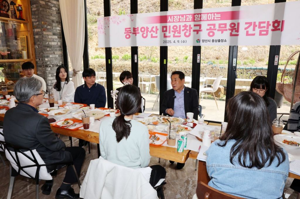 이번 간담회는 악성민원으로 힘들어하는 웅상출장소와 동부양산 4개 동 민원담당 공무원들을 격려하고, 애로사항을 경청해 더 나은 업무환경을 조성하기 위한 일환으로 마련됐다.