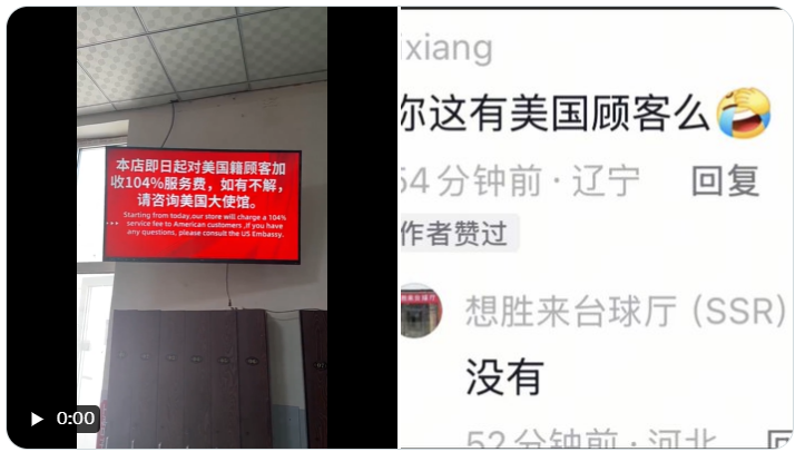 도널드 트럼프 미국 대통령이 중국에 대해서만 유예 없이 125%의 관세를 즉시 발효한 가운데, 중국의 한 당구장 주인이 미국인 고객에 한해서 서비스 수수료를 부과하겠다고 내걸었다.