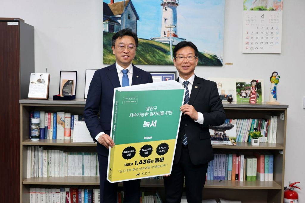 박병규 광산구청장이 이용우 국회의원에게 ‘광산구 지속가능 일자리 녹서’를 전달하고 있다. 광산구 제공