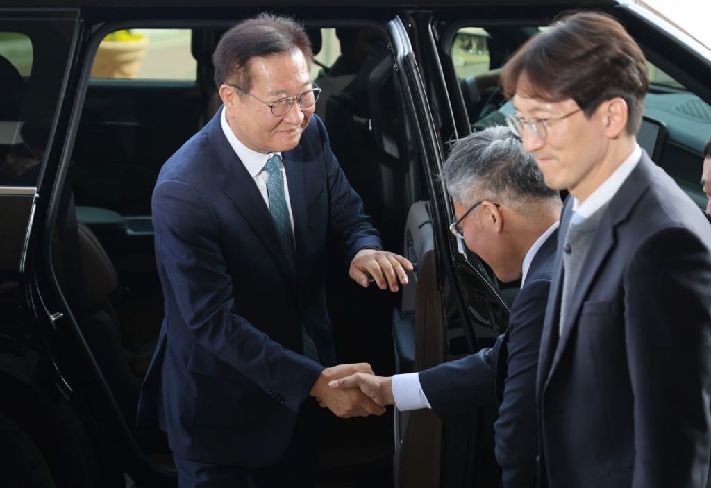 박성재 법무부 장관이 10일 과천 법무부 청사로 출근하며 김석우 차관과 인사하고 있다. 헌법재판소는 이날 박 장관에 대한 국회의 탄핵소추를 기각했다. 연합뉴스