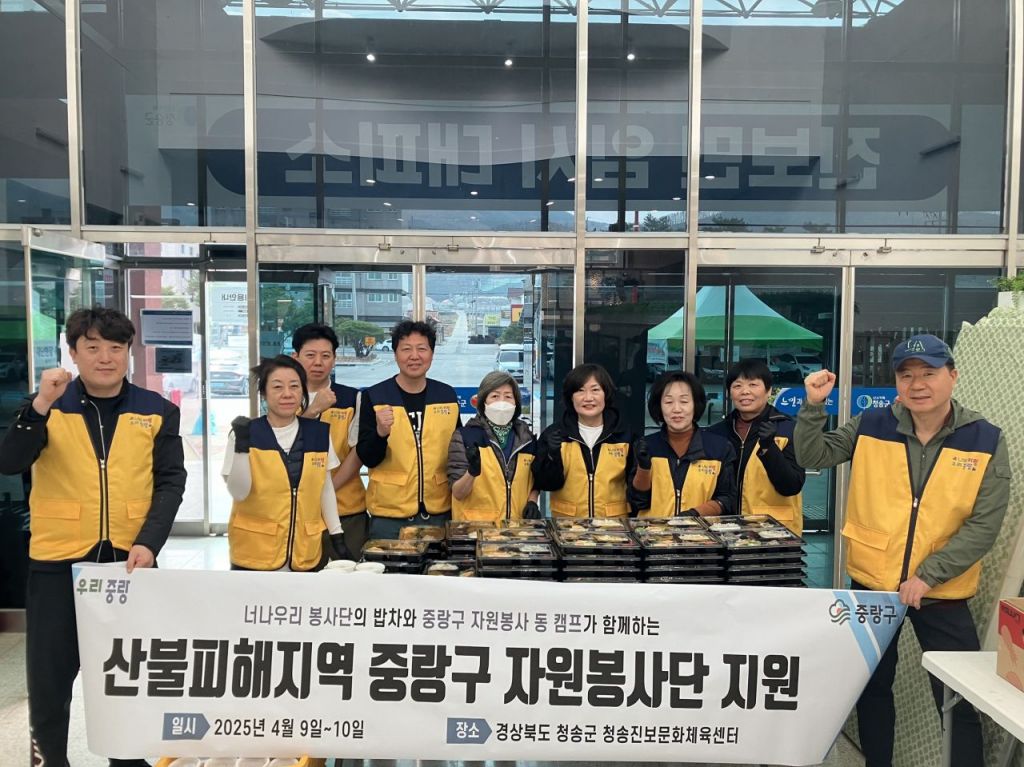 지난 9일과 10일 중랑구 자원봉사단은 경북 청송 산불피해지역을 찾아가 '사랑의 밥차'를 운영했다. 이번 봉사는 산불 피해 지역에 따뜻한 식사를 전하고자 너나우리 봉사단(단장 천현민)이 자비로 음식을 제공하겠다고 뜻을 전해오면서 시작되었고, 이에 동 자원봉사캠프 활동가들이 기꺼이 함께하겠다고 나서며 성사되었다. 이들은 이틀간 하루 200인분씩, 총 400인분의 따뜻한 식사를 이재민들에게 제공하며 위로와 응원의 마음을 전했다.