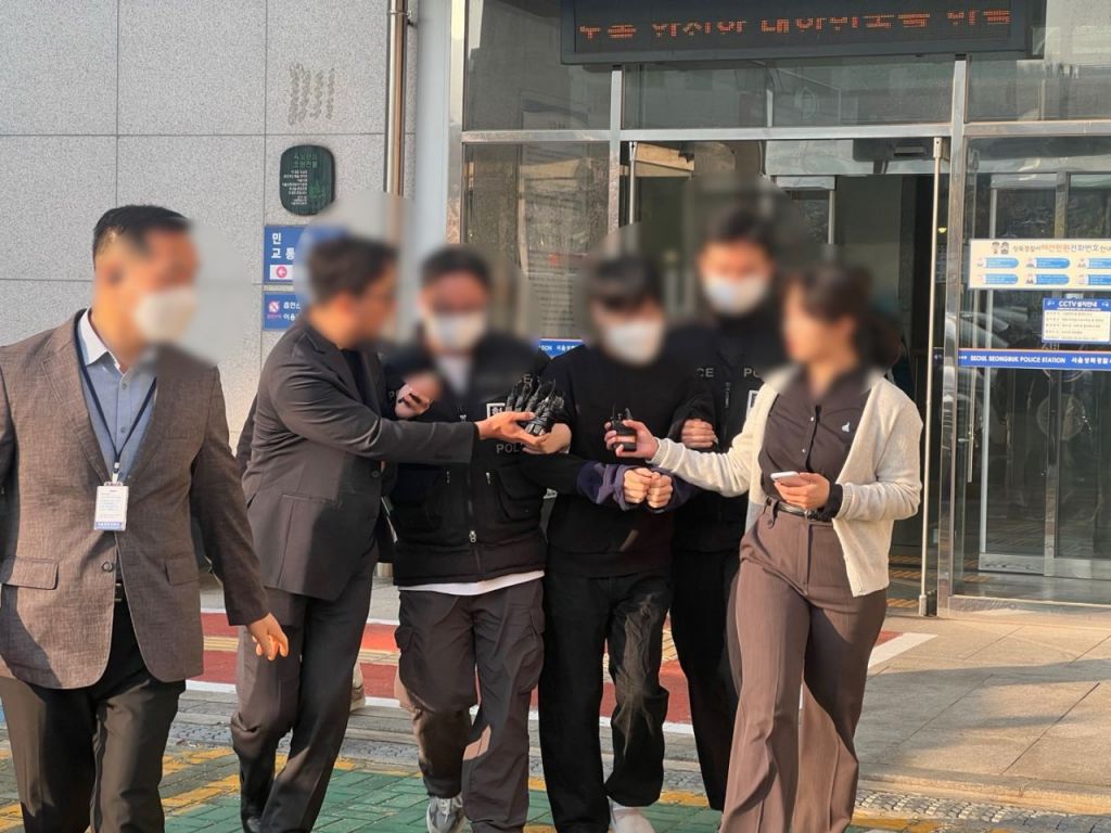 성북경찰서 정문에서 피의자 A씨가 송치되고 있다.