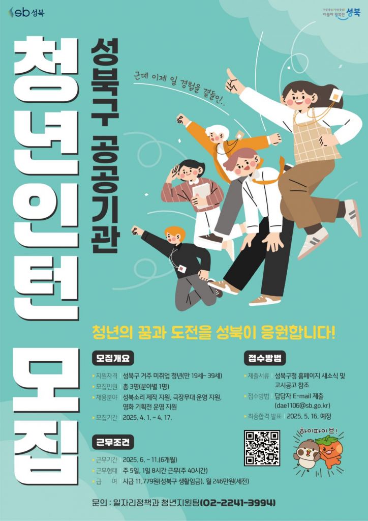 이번 사업에서는 성북구청 홍보전산과(성북소리 제작 지원), 꿈빛극장(극장무대 운영 지원), 아리랑시네센터(영화 기획전 및 영화제 운영 지원) 등 3개 분야에서 각 1명씩 총 3명을 선발한다.