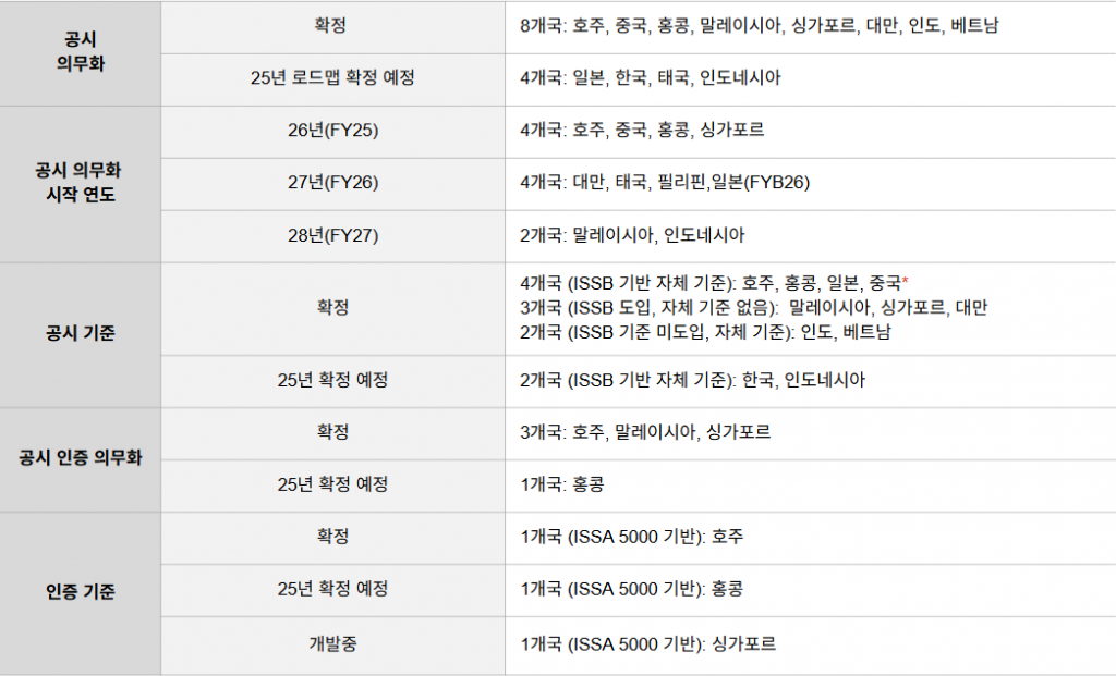 보고서에 따르면 자체 기준을 채택한 인도와 베트남을 제외하면 현재 호주, 중국, 홍콩, 말레이시아, 싱가포르, 대만 등 6개국은 국제지속가능성기준위원회(ISSB)의 국제회계기준(IFRS) S1·S2를 기반으로 공시 의무화를 확정했다. 한국을 포함한 4개국(일본, 태국, 인도네시아)도 올해 안에 공시 로드맵을 확정할 전망이다. 특히 일본은 지난 3월 지속가능성 공시 기준을 확정한 후, 내년 정보를 2027년 공시할 계획이다.