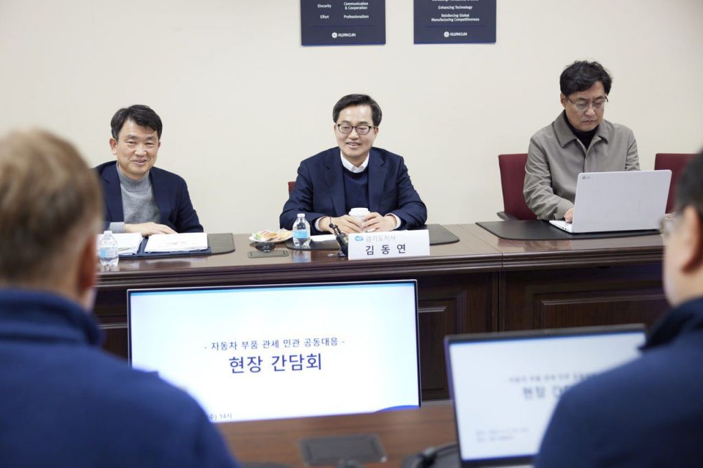 김동연 경기도지사가 지난 9일(현지시간) 미국 미시간주에 있는 광진아메리카를 방문해 회사 관계자들과 트럼프 상호관세 영향 등에 대해 이야기를 나누고 있다. 경기도 제공