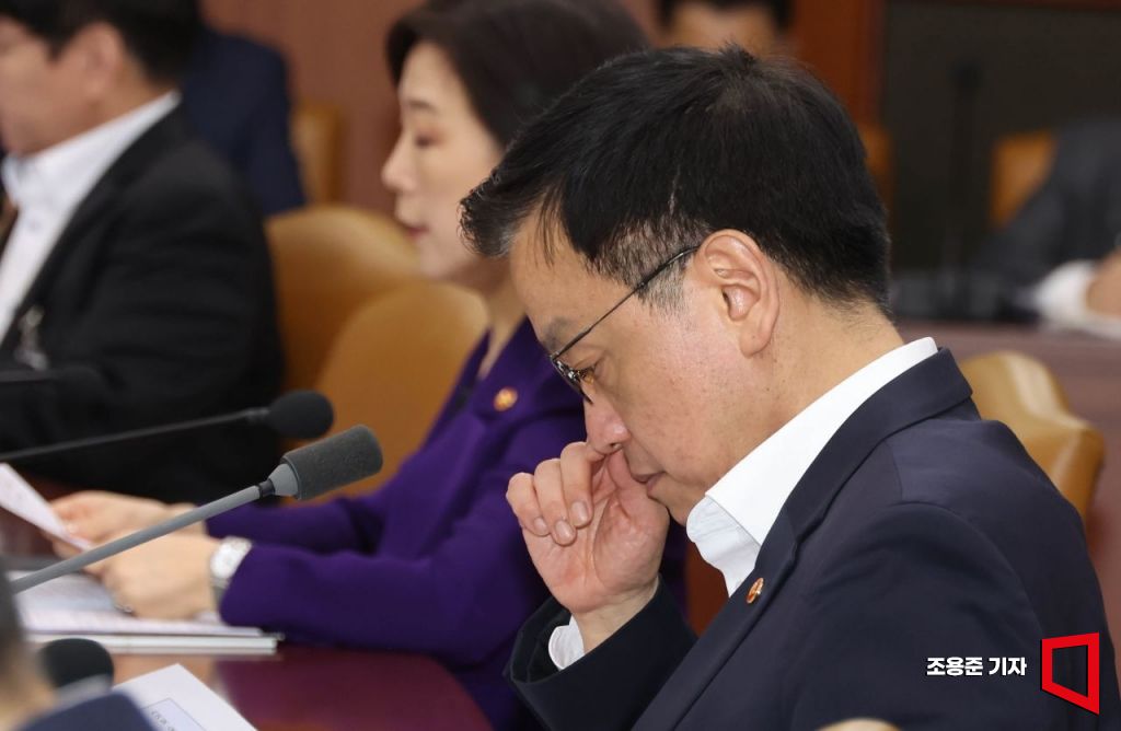 최상목 경제부총리 겸 기획재정부 장관이 11일 서울 종로구 정부서울청사에서 열린 대외경제장관회의에 참석, 회의 자료를 보고 있다.