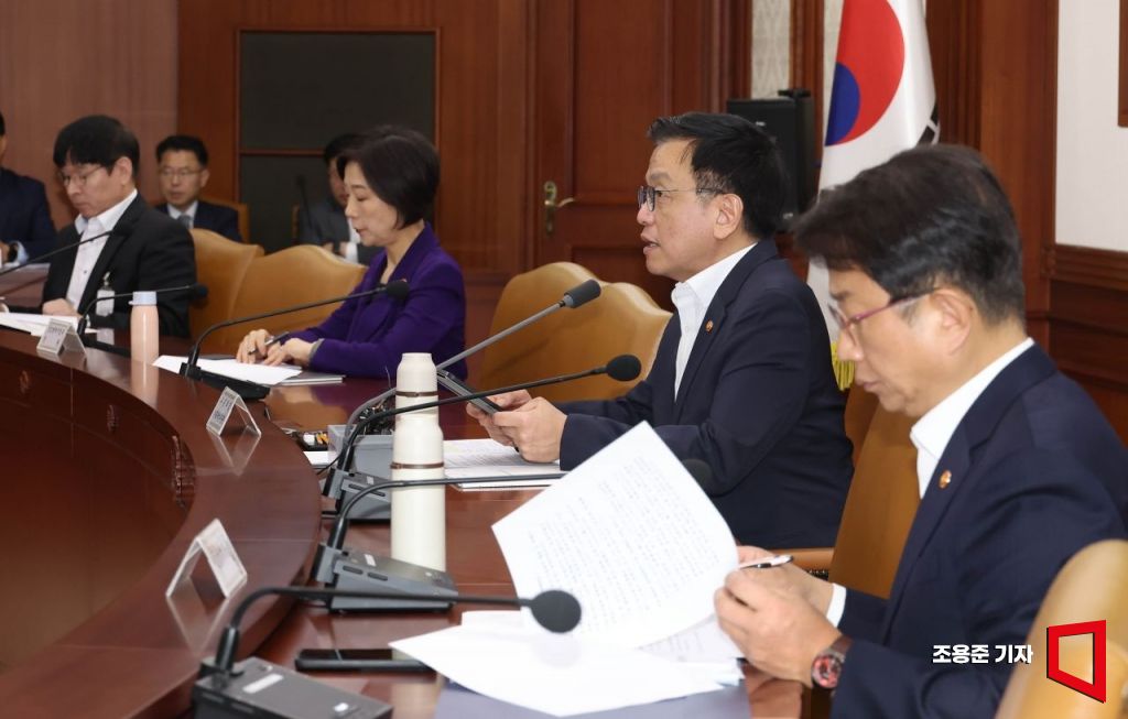 최상목 경제부총리 겸 기획재정부 장관이 11일 서울 종로구 정부서울청사에서 열린 대외경제장관회의에 참석, 미 관세부과 조치에 따른 우리 거시경제 영향 등에 대해 발언하고 있다.