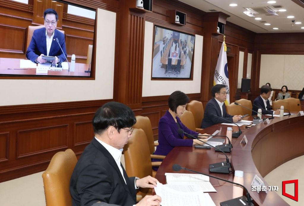 최상목 경제부총리 겸 기획재정부 장관이 11일 서울 종로구 정부서울청사에서 열린 대외경제장관회의에 참석, 미 관세부과 조치에 따른 우리 거시경제 영향 등에 대해 발언하고 있다.