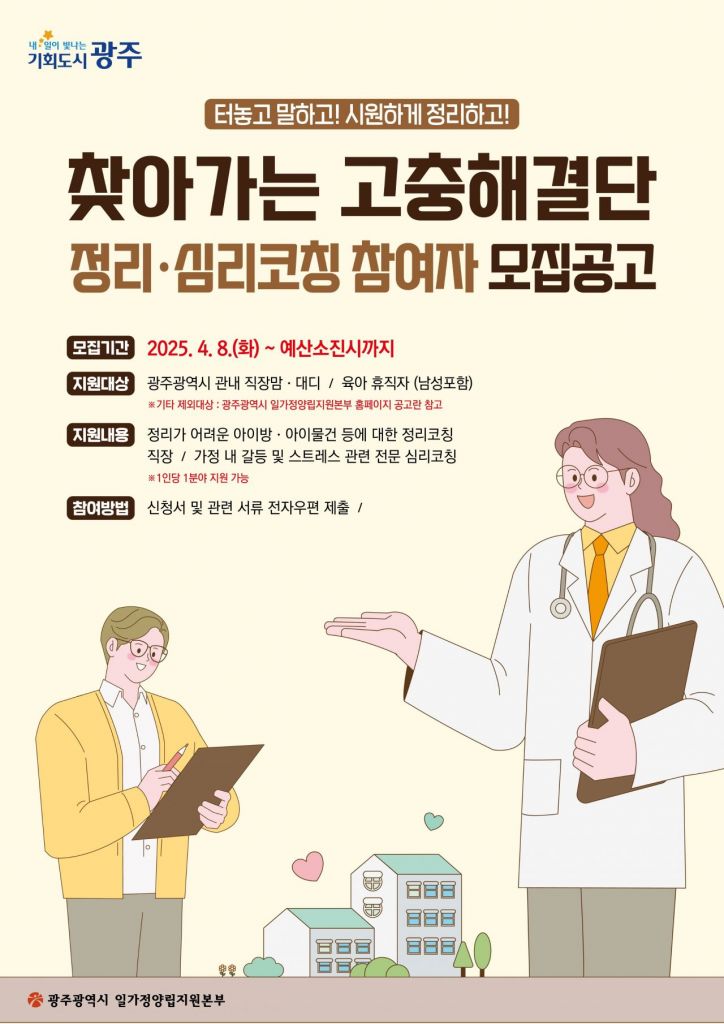 신청은 이메일로 접수받으며, 예산 소진 때까지 가능하다. 자세한 내용은 광주시 일가정양립지원본부 누리집 공지사항에서 확인할 수 있다.
