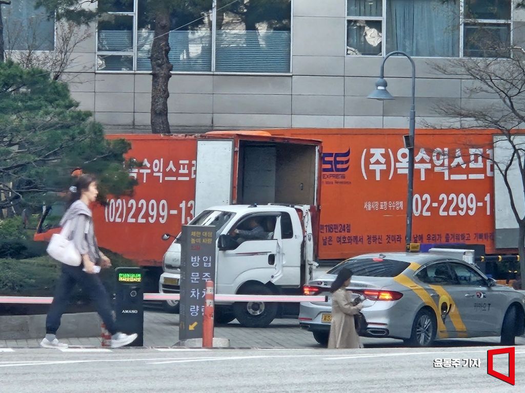 윤석열 전 대통령이 한남동 관저를 떠나 서초동으로 옮기기로 알려진 11일 서울 서초구 아크로비스타에 이사짐 차량이 분주히 움직이고 있다.