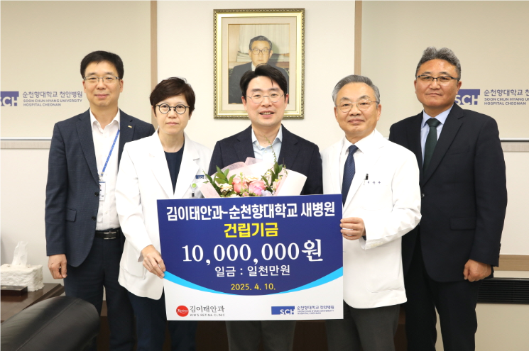 순천향대학교 부속 천안병원은 천안 김이태안과로부터 새병원 건립기금 1000만 원을 전달받았다고 11일 밝혔다.