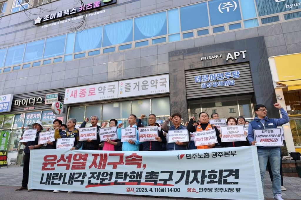 민주노총 광주지역본부는 11일 오후 서구 더불어민주당 광주시당 앞에서 기자회견을 열고 "윤 전 대통령이 파면된 지 일주일이 지났지만, 반성은커녕 사과조차 없다"며 "오히려 관저에서 버티며 지지자를 초청, 격려하고 메시지를 통한 관저 정치에 골몰하고 있다"며 이같이 밝혔다.