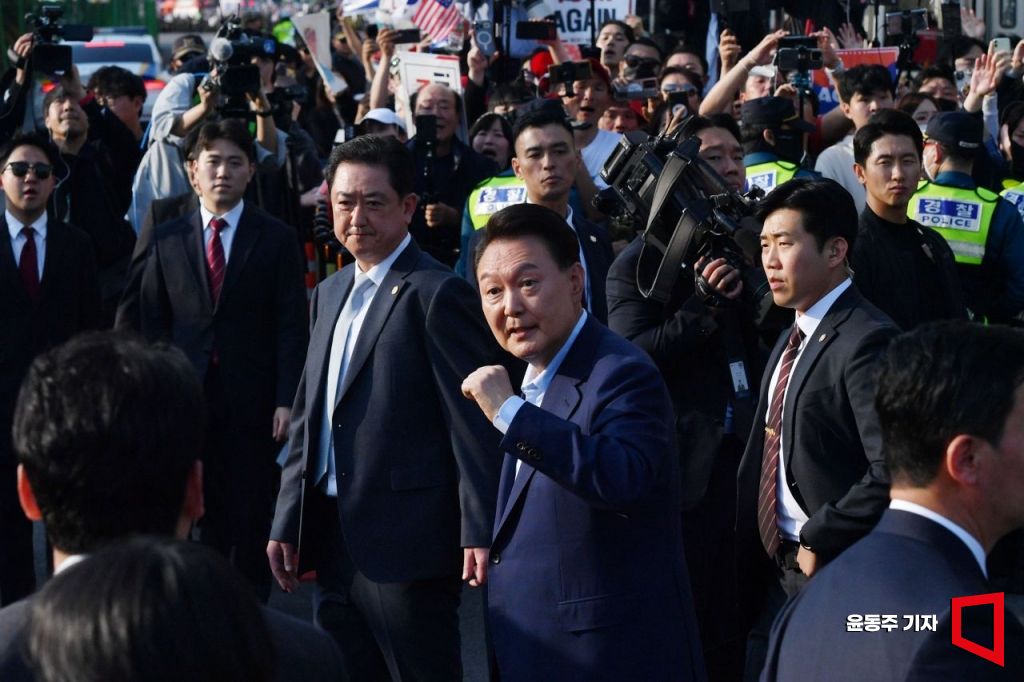윤석열 전 대통령이 11일 서울 용산구 한남동 대통령 관저를 떠나 서초동 사저로 이동하며 지지자들과 인사를 하고 있다.