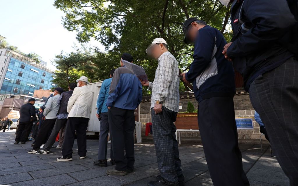 서울 종로구 탑골공원 원각사 노인 무료급식소 앞에 어르신들이 점심식사를 위해 줄지어 서 있다. 연합뉴스