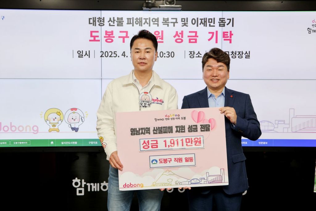 서울 도봉구(구청장 오언석)가 영남 지역 산불피해 성금으로 도봉구청 직원 모금액을 포함한 성금 3782만 원을 경북 의성 등에 전달했다.