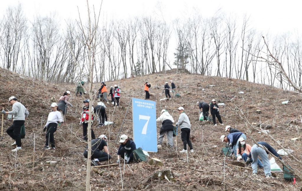 유한킴벌리 ‘우리강산 푸르게 푸르게 ‘2025 신혼부부 나무심기’ 행사가 12일 강원도 인제 자작나무숲에서 열렸다. 신혼부부 100쌍과 임직원 등 300명이 은행나무 4,500그루를 심었다.