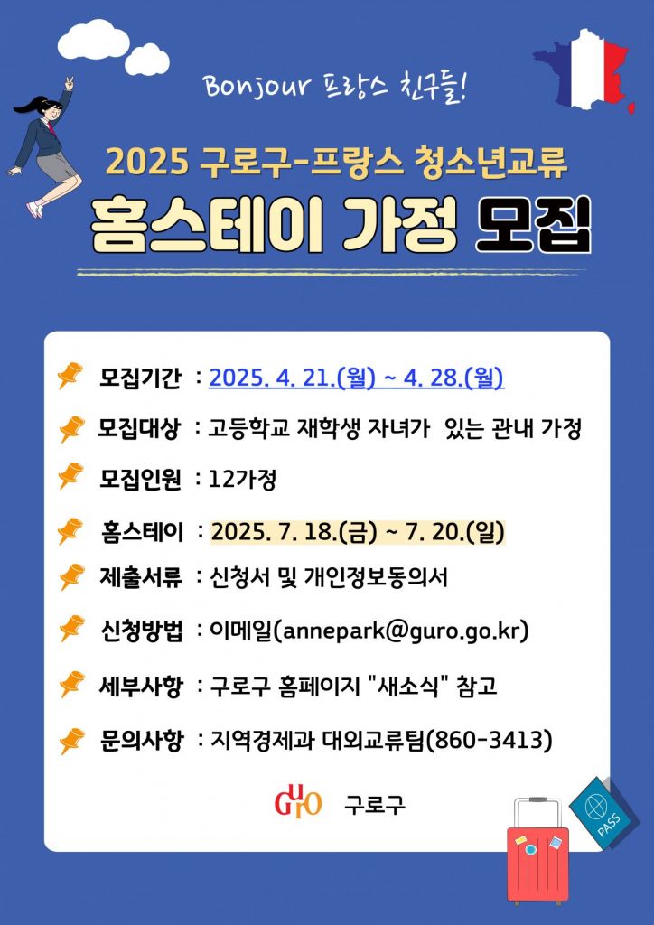 구로구(구청장 장인홍)가 오는 21일부터 28일까지 프랑스 이씨레물리노시 청소년을 맞이할 홈스테이 참여 가정을 모집한다고 밝혔다.