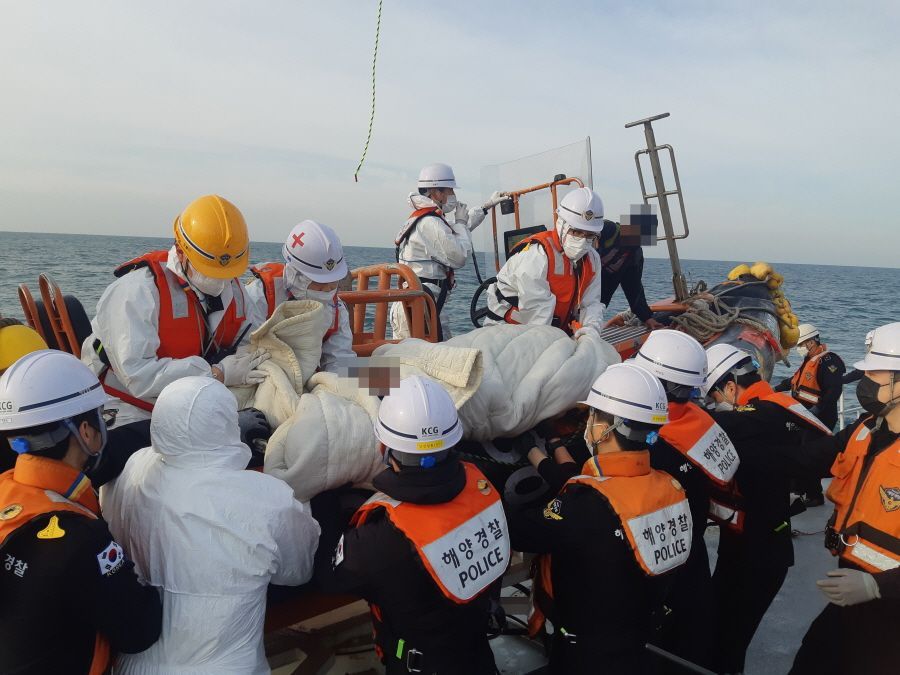 바다에 빠진 외국인 선원 긴급 이송 중인 여수 해경. 여수해양경찰서
