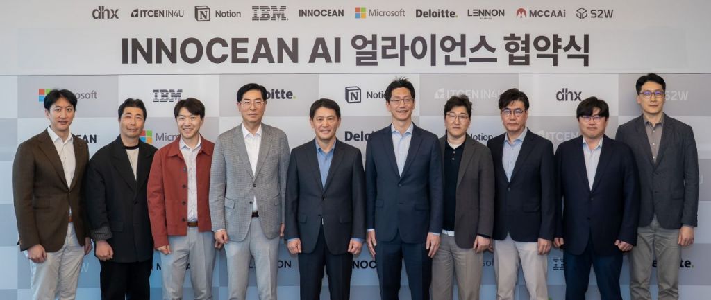 이노션 AI 얼라이언스 협약식. 왼쪽부터 김성우 디에이치엑스 대표, 이종복 아이티센인포유 대표, 안세진 노션 파트너십리드, 김정호 한국아이비엠 전무, 이용우 이노션 대표, 강환빈 한국마이크로소프트 부문장, 정찬욱 딜로이트 컨설팅 코리아 전무, 장호석 스튜디오레논 대표, 최재호 맥케이 대표, 서상덕 에스투더블유 대표