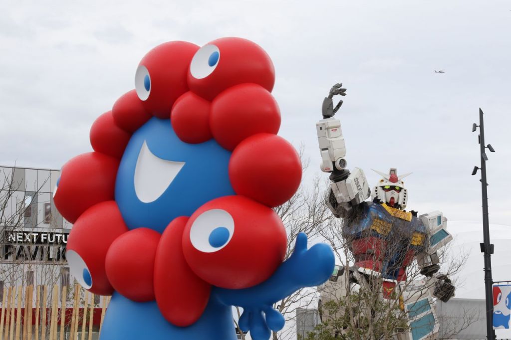 오사카·간사이 만국박람회(오사카 엑스포)가 개막한 13일 엑스포 캐릭터인 '먀쿠먀쿠'와 대형 건담 모형이 보인다. 연합뉴스