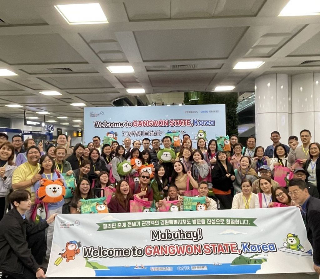 지난 12일, 강원도 양양공항을 통해 전세기로 입국한 춘계 첫 필리핀 단체관광객 60여명이 강원도가 마련한 환영행사에 참가한 후 기념촬영을 하고 있다. 필리핀 춘계 단체관광객은 20일까지 전체 300명이 양양공항을 통해 입국 후 강원도를 여행할 예정이다. 사진=강원특별자치도청 제공