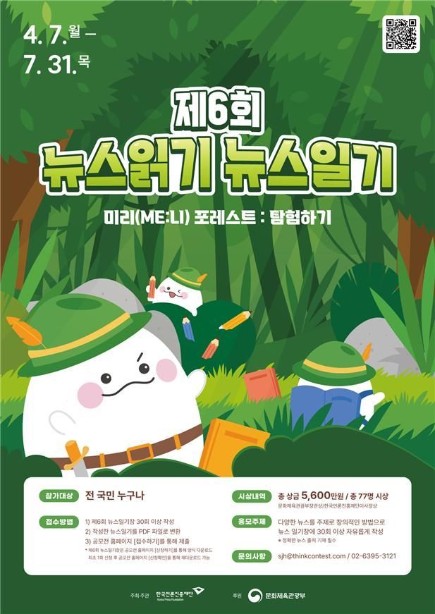 이번 공모전에서는 어린이, 청소년, 성인 등 개인 부문과 우수지도자 부문에서 총 77명을 선정해 총 5600만원 규모의 상금을 시상한다. 특히 청소년의 뉴스 읽기·쓰기 참여를 독려하기 위해 일기장 제출이 많은 상위 3개 학교에는 총 500만원 상당의 간식을 지원하는 등 다양한 이벤트도 진행한다. 참가 방법, 공모 요강 등 자세한 정보는 공식 누리집에서 확인할 수 있다.