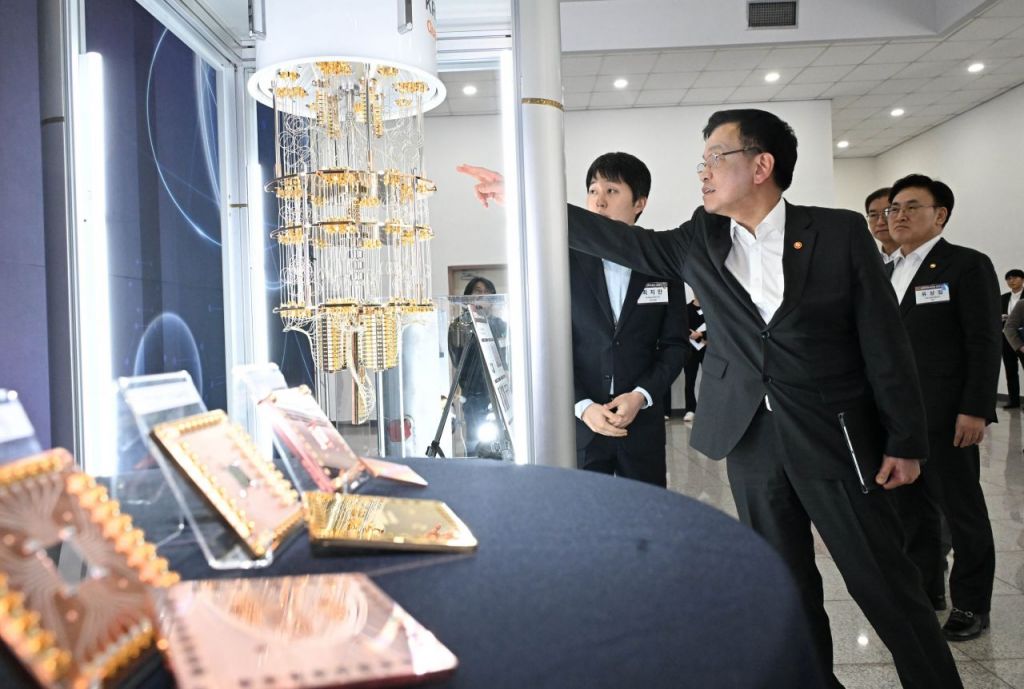 최상목 대통령 권한대행 부총리 겸 기획재정부 장관이 지난달 12일 대전 한국표준과학연구원에서 열린 양자전략위원회 1차 회의 참석에 앞서 양자컴퓨터와 핵심소자인 양자 프로세서 유닛(QPU) 설명을 듣고 있다. 연합뉴스
