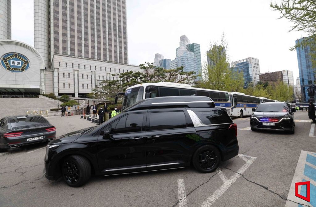 내란 우두머리 혐의로 기소된 윤석열 전 대통령의 첫 정식 형사재판이 열리는 14일 오전 윤 전 대통령이 탑승한 차량이 서울 서초구 서울중앙지방법원 지하주차장으로 들어가고 있다. 2025.4.14 사진공동취재단