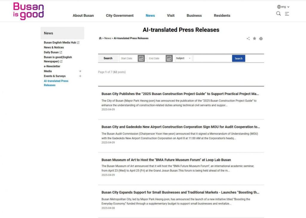 부산시 영문홈페이지 AI-translated Press Releases 메뉴 화면.